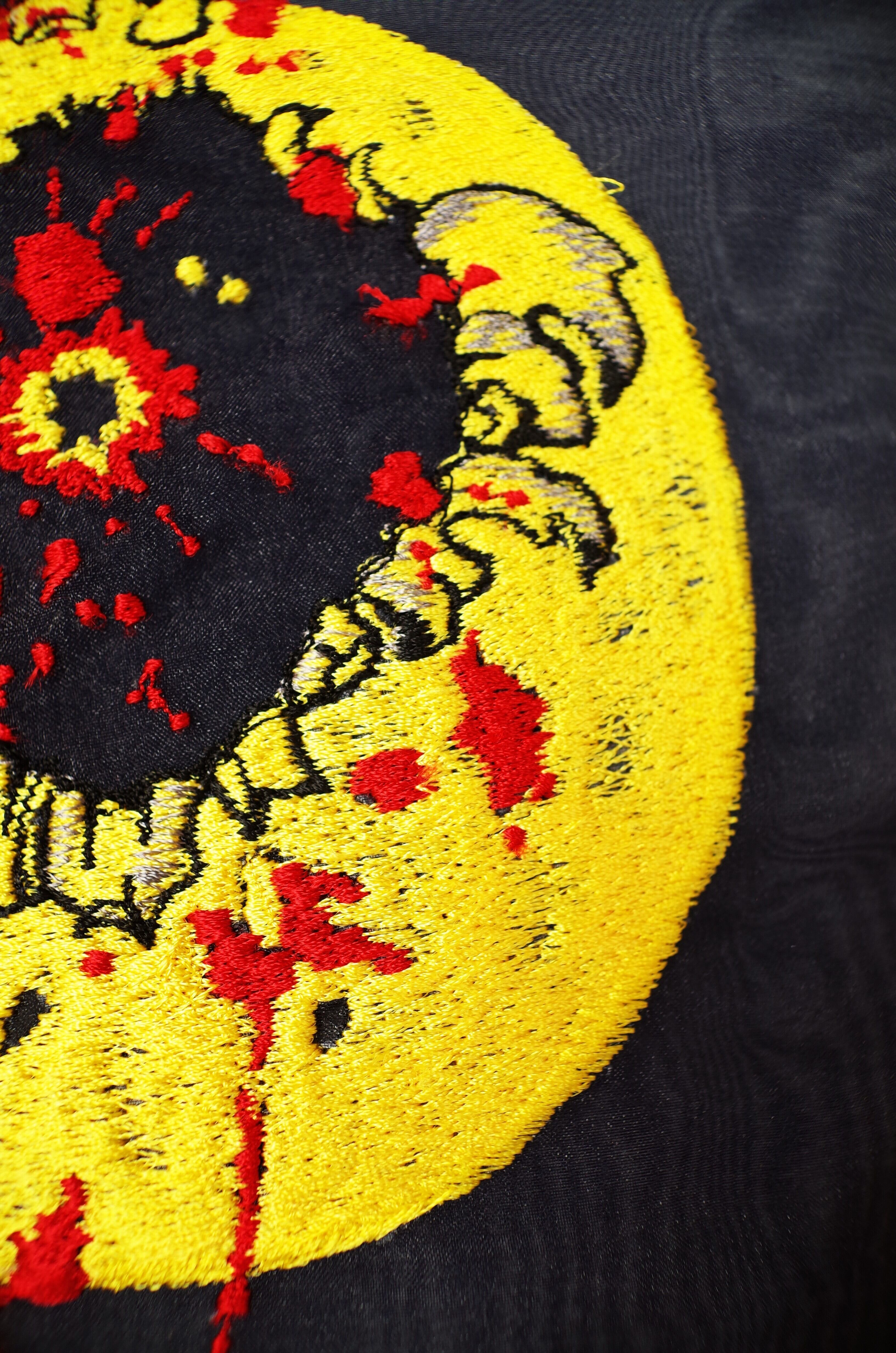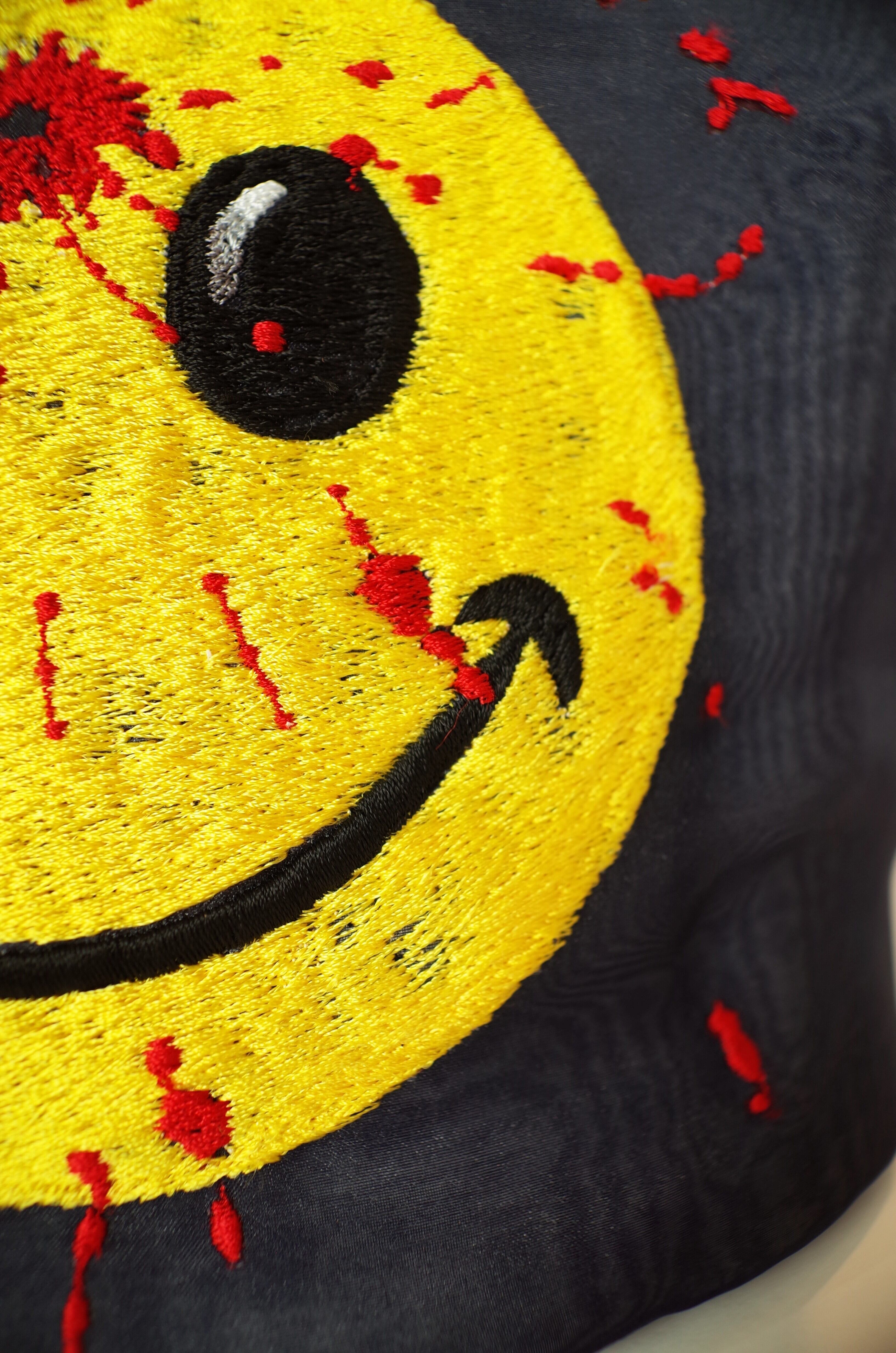 別でスマイルを刺繍で作成し、ワッペンのように張り付けてから仕上げ刺繍をしているため、